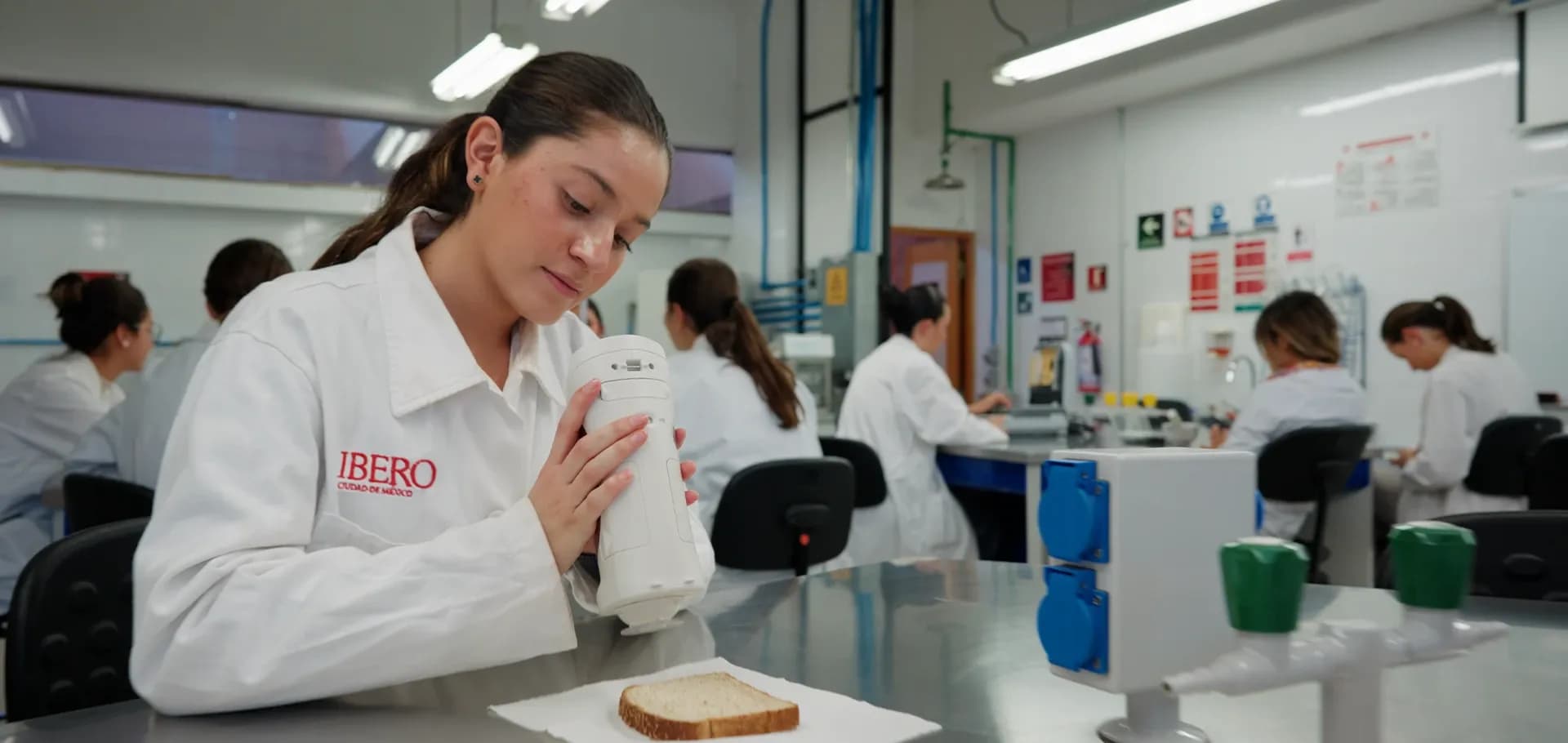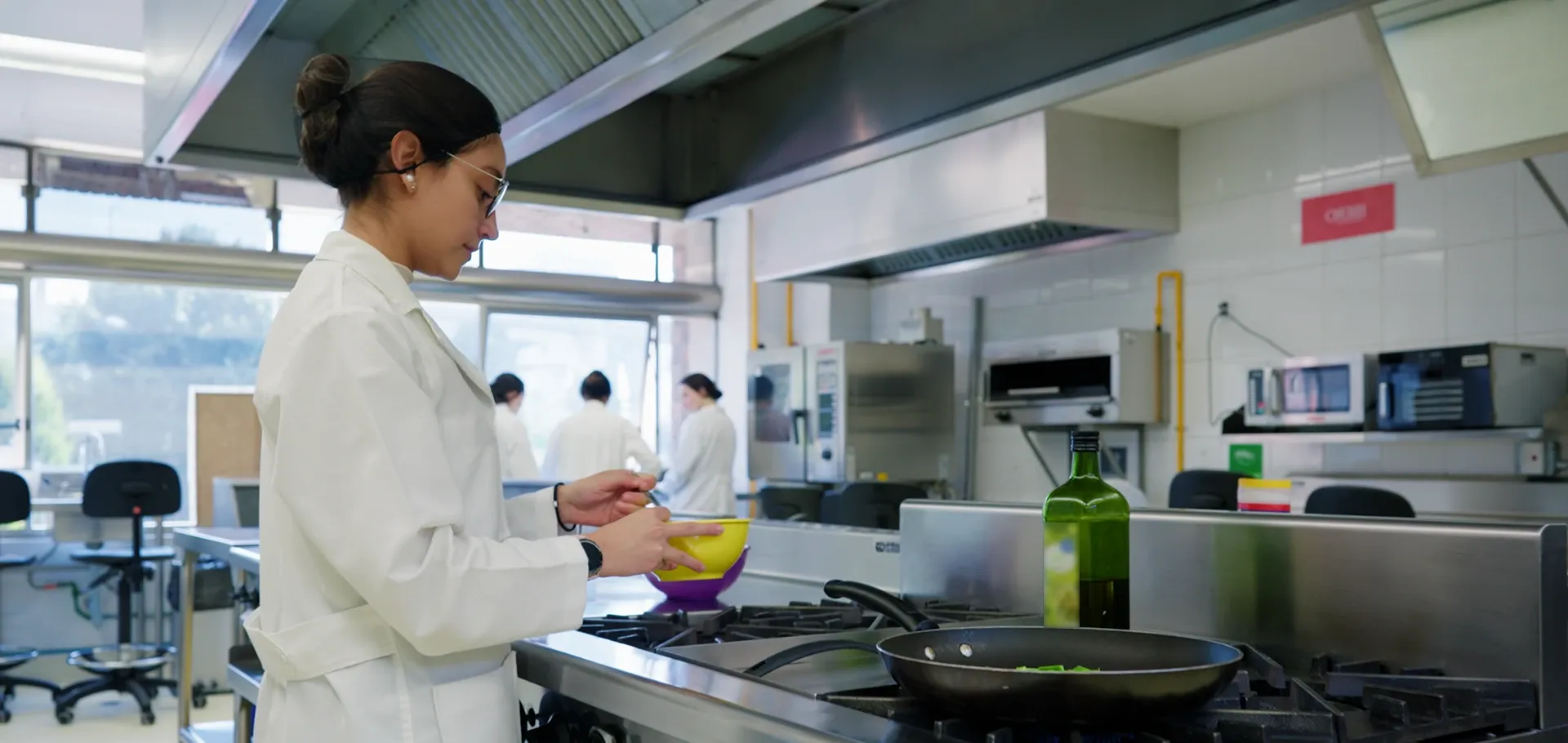 Este laboratorio es un espacio dedicado al desarrollo de competencias culinarias y de inocuidad alimentaria. Cumple con la NOM-251-SSA-2009 de Prácticas de Higiene para el Proceso de Alimentos, Bebidas o Suplementos Alimenticios. Cuenta con un área principal equipada con estufas y hornos de gas, un horno industrial, una salamandra, refrigeradores, congeladores, una fábrica de hielos, tarjas y mesas de trabajo.
