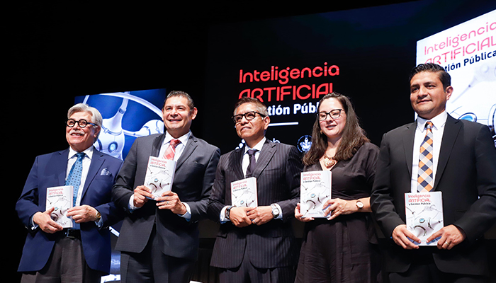| El 22 de junio pasado, se presentó el libro ‘Inteligencia Artificial y Gestión Pública’ en la BUAP. En la imagen, el gobernador del estado, Alejandro Armenta Mier (segundo de izq. a der.) y autores del volumen, entre ellos, el Dr. Ulises Cruz, académico de la IBERO (extrema derecha). Foto cortesía del gobierno de Puebla. |