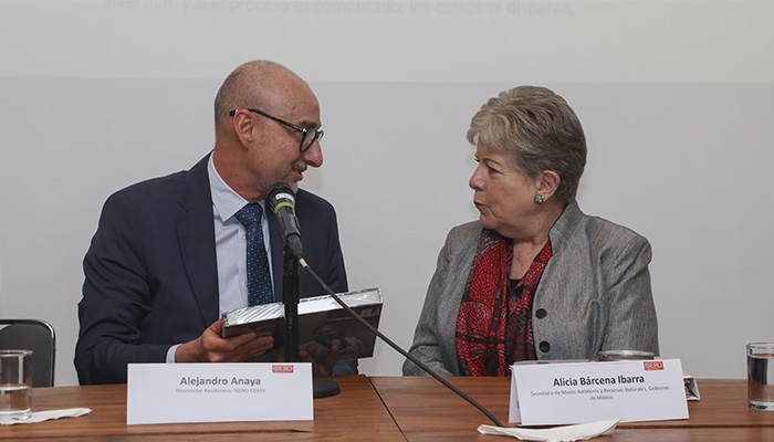 | El Vicerrector Académico de la IBERO, Dr. Alejandro Anaya, y la Secretaria de Medio Ambiente y Recursos Naturales de México, Alicia Bárcena. |