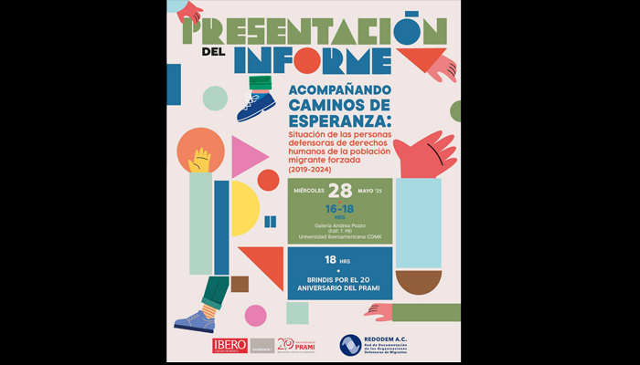 El miércoles 28 de mayo a las 16:00 horas, el Programa de Asuntos Migratorios (PRAMI) de la Universidad Iberoamericana Ciudad de México, en colaboración con la Red de Documentación de Organizaciones Defensoras de Migrantes (REDODEM), presentará el informe “Acompañando caminos de esperanza: La situación de las personas defensoras de población migrante forzada (2019-2024)”.