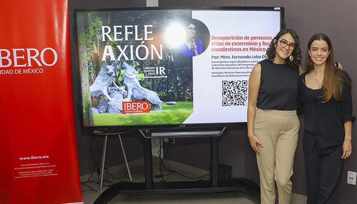 | La Mtra. Fernanda Lobo Díaz (izq.) y Mariana Marchand Moreno (der.) ofrecieron la sesión de RefleAxión titulada “Desaparición de personas, sitios de exterminio y fosas clandestinas en México”. Foto: Elihú Cortés. |
