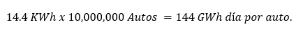14.4 KWh consume de energía cada auto al día en promedio. Multiplicado por los 10 millones equivalente al 55% del parque vehicular de uso privado, obtenemos la energía requerida para el suministro de energía: