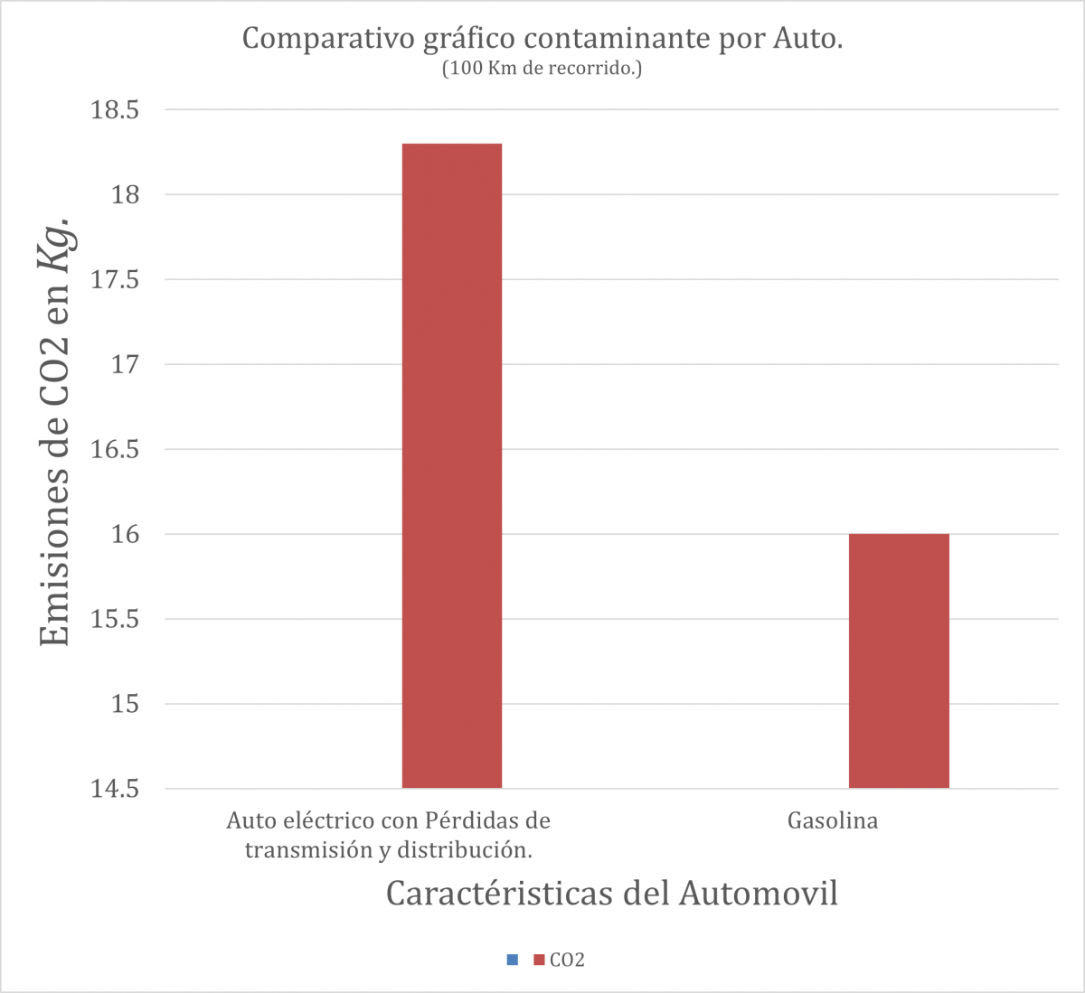 Del ejemplo anterior tenemos que el auto eléctrico emite 15.3 Kg de CO2 cada 100 Km. sin incluir las pérdidas en el sistema de generación. En países como México las pérdidas alcanzan el 20% en el ciclo completo, por tanto, tenemos: