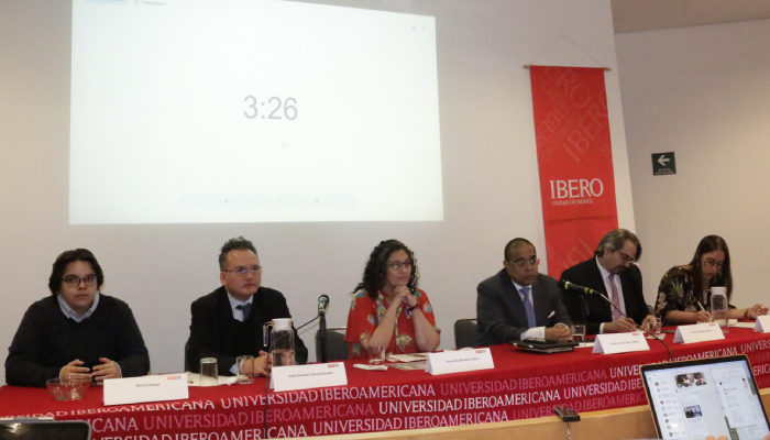 El panel 1 estuvo conformado por Guillermo Pablo López Andrade, Jaime Salvador García González, Dora Alicia Martínez Valero y Luis Edwin Molinar Rohana, quienes fueron presentados por Camila Solís, del Observatorio Ciudadano, y María Santoyo, de la Sociedad de estudiantes de Derecho.