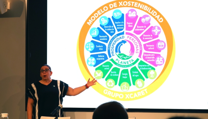 Señaló que el modelo de sostenibilidad de Xcaret tiene que girar en equilibrio para que las y los colaboradores sepan cómo comunicar los principios del Grupo a clientes, proveedores, aliados comerciales, academia, centros de investigación, gobiernos, instituciones financieras y organizaciones gremiales.