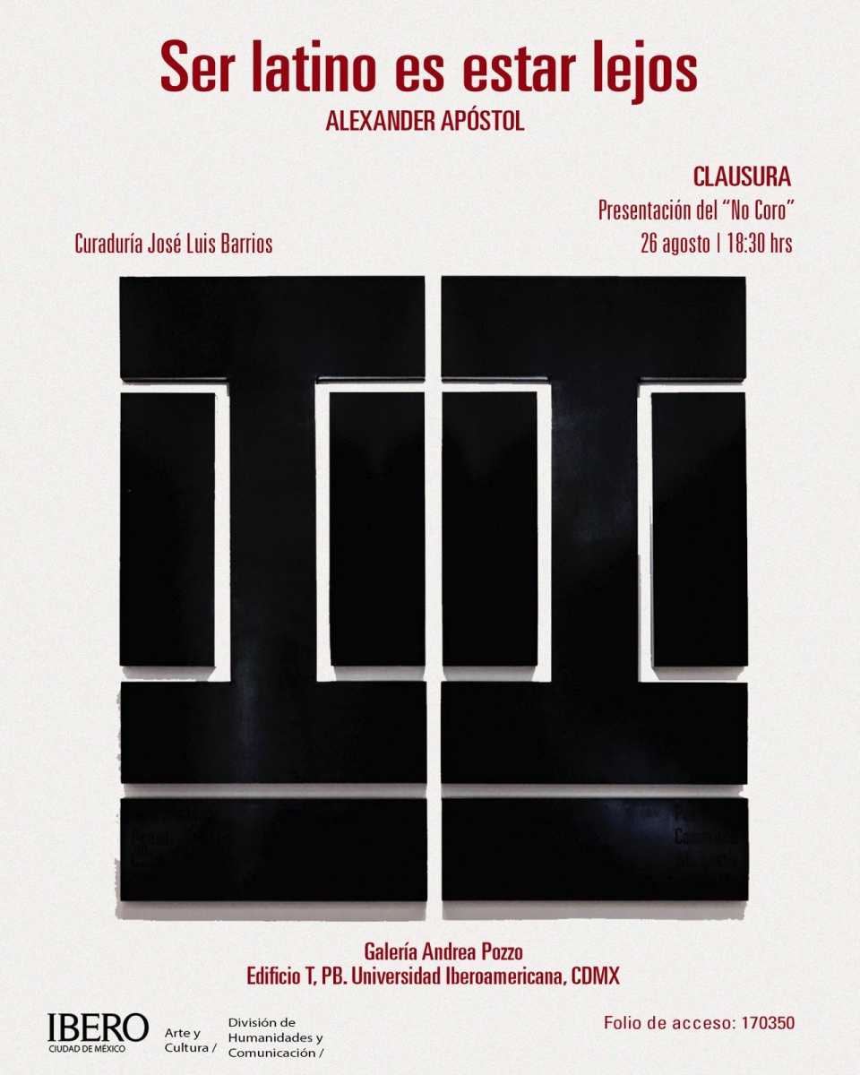 La Universidad Iberoamericana Ciudad de México despide Ser latino es estar lejos, exposición del artista venezolano Alexander Apóstol, con un evento único que incluirá la última presentación en vivo de la pieza coral, compuesta por Elisa Schmelkes, que acompaña a la obra, un montaje profundamente emotivo e imperdible. La cita es el martes 26 de agosto, a las 18:30 horas, en la Galería Andrea Pozzo del campus.