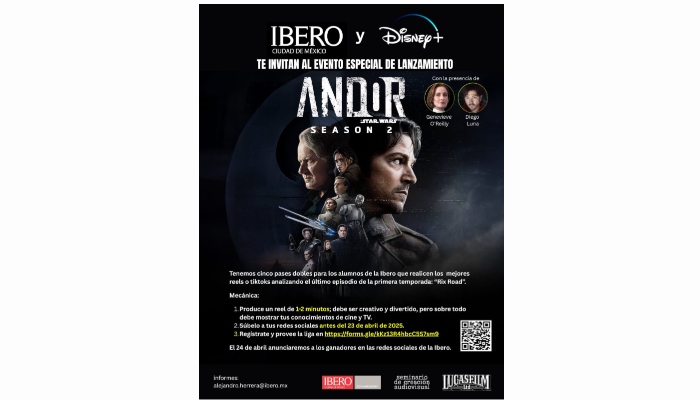 La Universidad Iberoamericana, a través de su Departamento de Comunicación, y en alianza con Disney y LucasFilm, invitó al alumnado de la institución educativa confiada a la Compañía de Jesús a participar en una dinámica para ganar uno de los cinco pases dobles disponibles para asistir al evento de lanzamiento de la segunda temporada de Andor, la serie del universo de Star Wars. El evento contará con la presencia de los protagonistas, Diego Luna y Genevieve O'Reilly.