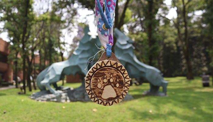 Tamuje Iwigara es el colectivo que talló las medallas en madera de pino en la Sierra Tarahumara, lo cual “transfiere un significado a la medalla, porque ya no es cualquier objeto, sino que viene de nuestra madre tierra y de un árbol. Es sagrado”, aseguró la Mtra. Eugenia Legorreta Maldonado, Coordinadora del Programa de Interculturalidad y Asuntos Indígenas (PIAI) de la IBERO.