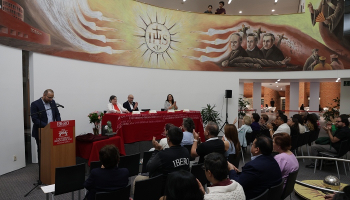 La Directora dela Biblioteca encabezó el presídium de la ceremonia, acompañada del Rector Dr. Luis Arriaga Valenzuela, S.J.; el Dr. Alejandro Anaya Muñoz, Vicerrector Académico; y la Mtra. Brenda Contreras Hernández, Coordinadora de Servicios a Usuarios en este histórico espacio.