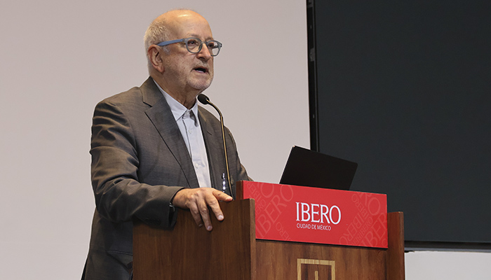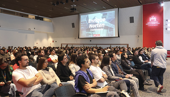 • Enrique Norten, arquitecto egresado de la IBERO y referente nacional e internacional, habló con estudiantes sobre el valor de aprender de lo no construido. Foto: Guillermo Gutiérrez Godoy.