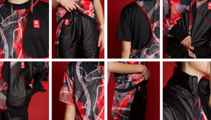 Usó tela tecnológica dri-fit que es muy buena para la ventilación y para mantenerse fresco durante el ejercicio. En los pants y la chamarra se enfocó en usar tela repelente al agua.