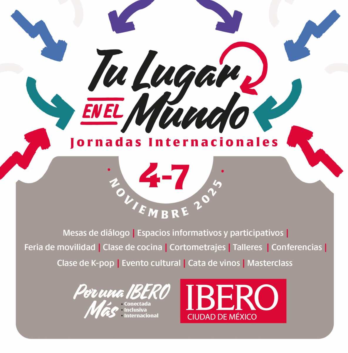 Durante cuatro días, la comunidad universitaria podrá participar en mesas de diálogo, conferencias, ferias de movilidad, talleres, proyecciones de cortometrajes, muestras gastronómicas, clases de cocina y actividades culturales, en un ambiente que celebra la apertura, la curiosidad y la cooperación global. Inscríbete aquí a las actividades: Tu lugar en el mundo.