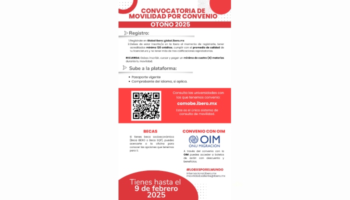 La Universidad Iberoamericana, a través de su Dirección de Internacionalización, invitó a las y los estudiantes que tengan interés en hacer movilidad estudiantil para que conozcan la Convocatoria de Movilidad por Convenio para el periodo Otoño 2025.